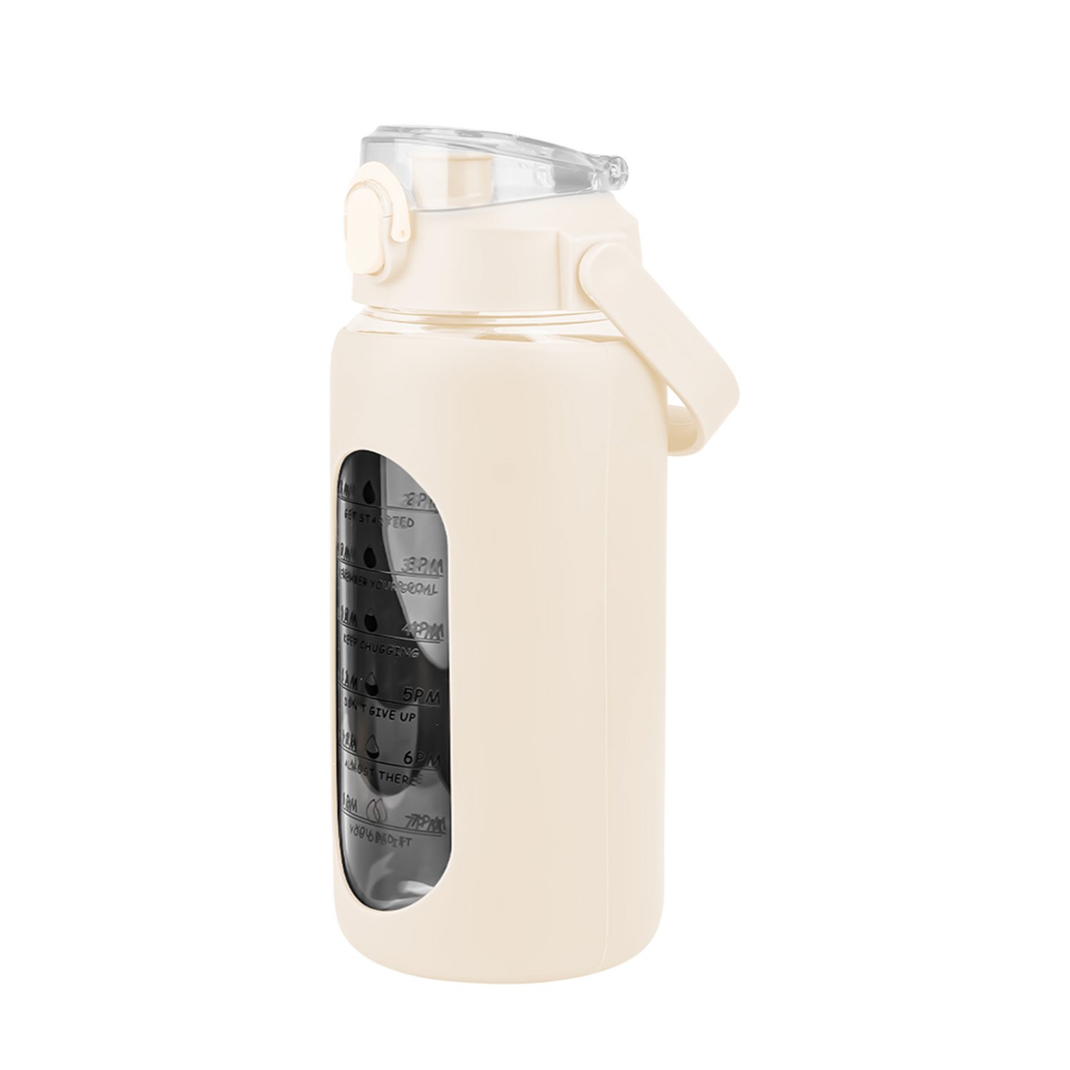 Are you tired of forgetting to stay hydrated throughout the day? Look no further than our motivational water bottle! Comes with timer markers and and precise volume on the side, helping you track your water intake with ease. With its large capacity(32Oz or 64 Oz), you can refill the sports water bottle up less frequently and keep yourself refreshed all day long. Made of high borosilicate glass, suitable for both warm and cold beverages, heat-resistant, dishwasher safe and healthy to use. Slip resistant with silicone sleeve and easy to carry with a built-in handle. And for added convenience, it features a built-in straw, making it easy to drink water on the go. Plus, its stylish design and motivational messages will inspire you to keep pushing towards your health goals. So why wait? Invest in our water intake tracker bottle today and take the first step towards a healthier, happier you!