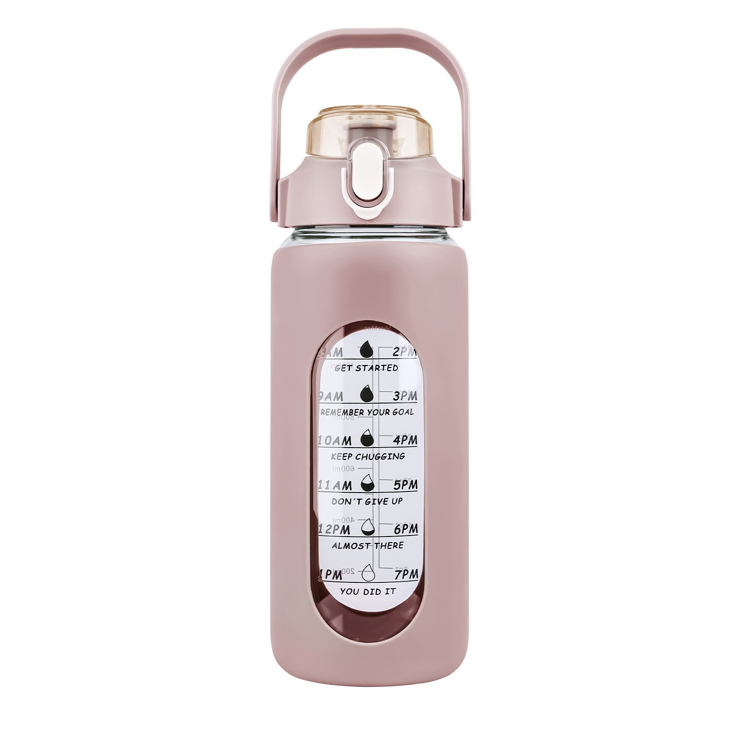 Are you tired of forgetting to stay hydrated throughout the day? Look no further than our motivational water bottle! Comes with timer markers and and precise volume on the side, helping you track your water intake with ease. With its large capacity(32Oz or 64 Oz), you can refill the sports water bottle up less frequently and keep yourself refreshed all day long. Made of high borosilicate glass, suitable for both warm and cold beverages, heat-resistant, dishwasher safe and healthy to use. Slip resistant with silicone sleeve and easy to carry with a built-in handle. And for added convenience, it features a built-in straw, making it easy to drink water on the go. Plus, its stylish design and motivational messages will inspire you to keep pushing towards your health goals. So why wait? Invest in our water intake tracker bottle today and take the first step towards a healthier, happier you!