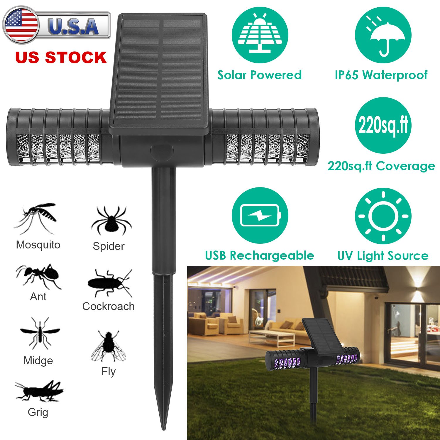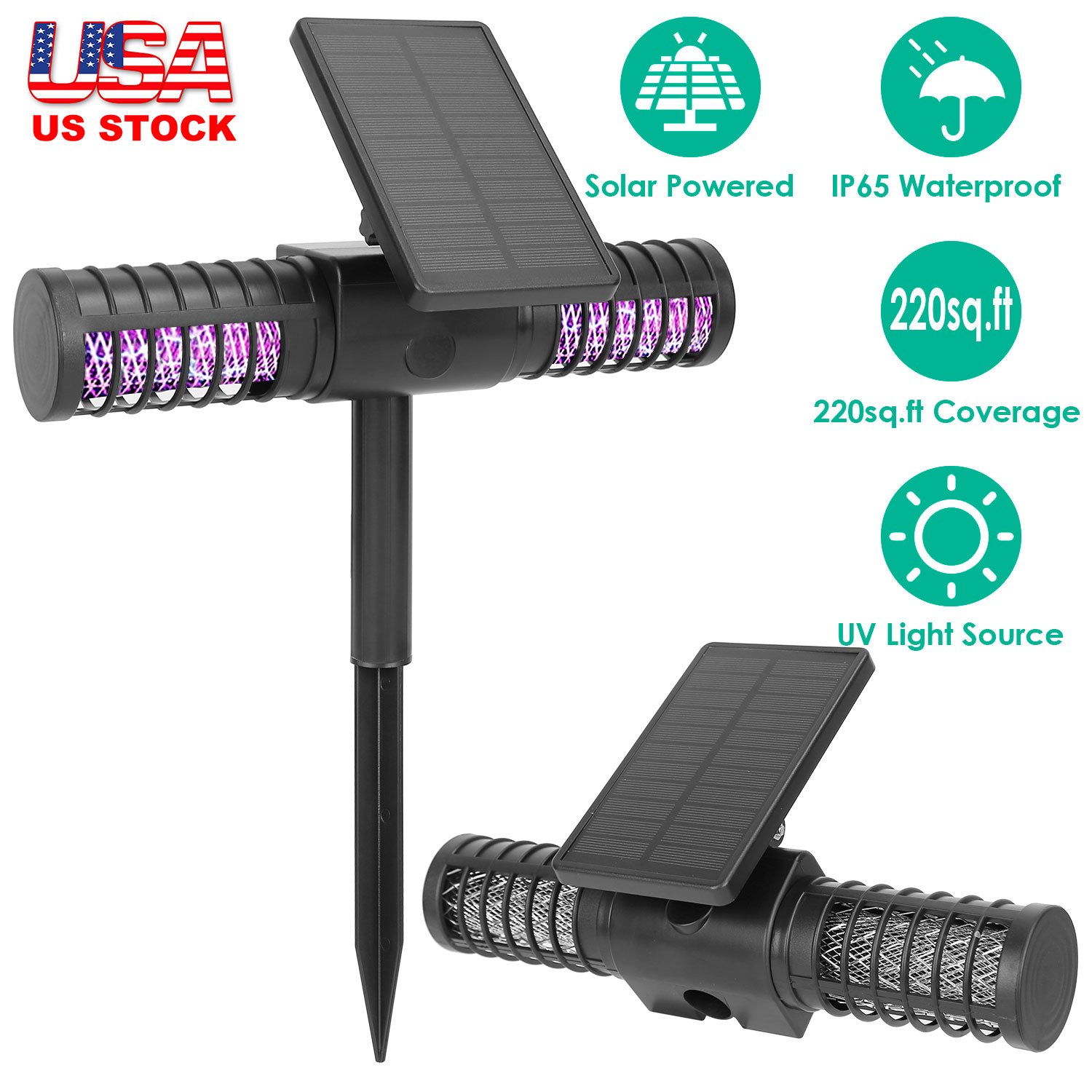 Summer is coming! Are you still trouble with the annoying mosquitoes? Our bug zapper is an optimal solution to protect your family from mosquito buzz and biting, which can lure the bugs by releasing UV light within 220sq.ft area and kill them instantly via high voltage grid. No chemical, non-toxic, safe for the infants, pregnant mother and pets. It can be charged by solar panel during day or via USB cable for about 4-6 hours for fully charge and ensures a whole night working. Perfect use to protect your family in this summer!