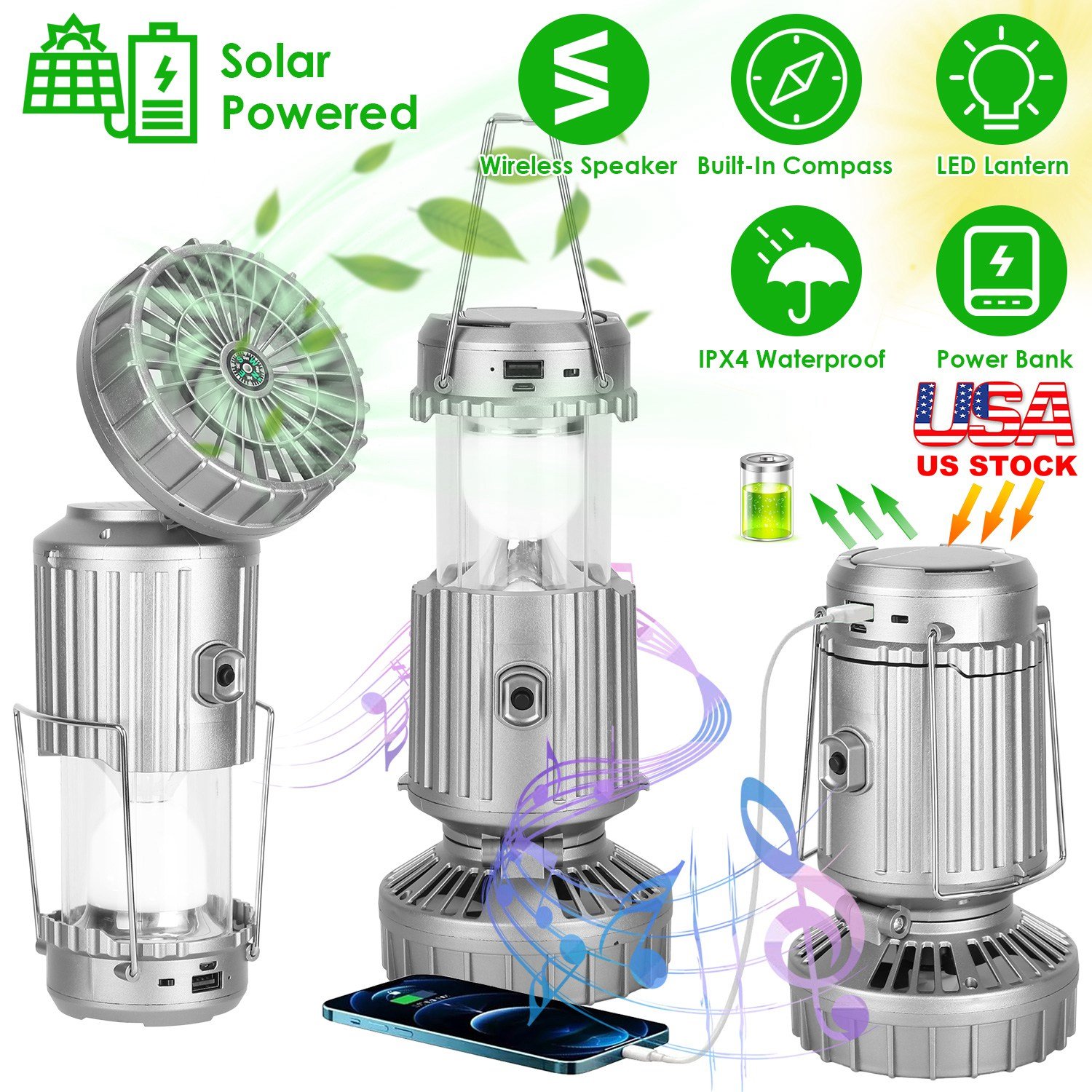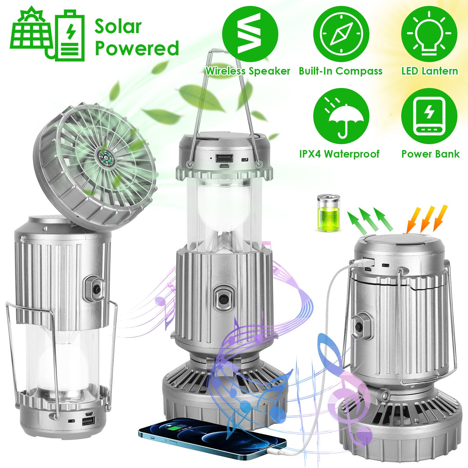 Camping Lantern with Fan Solar And USB Rechargeable LED Camping Fan With Wireless Speaker Compass Power Bank IPX4 Waterproof Emergency Hanging Light F