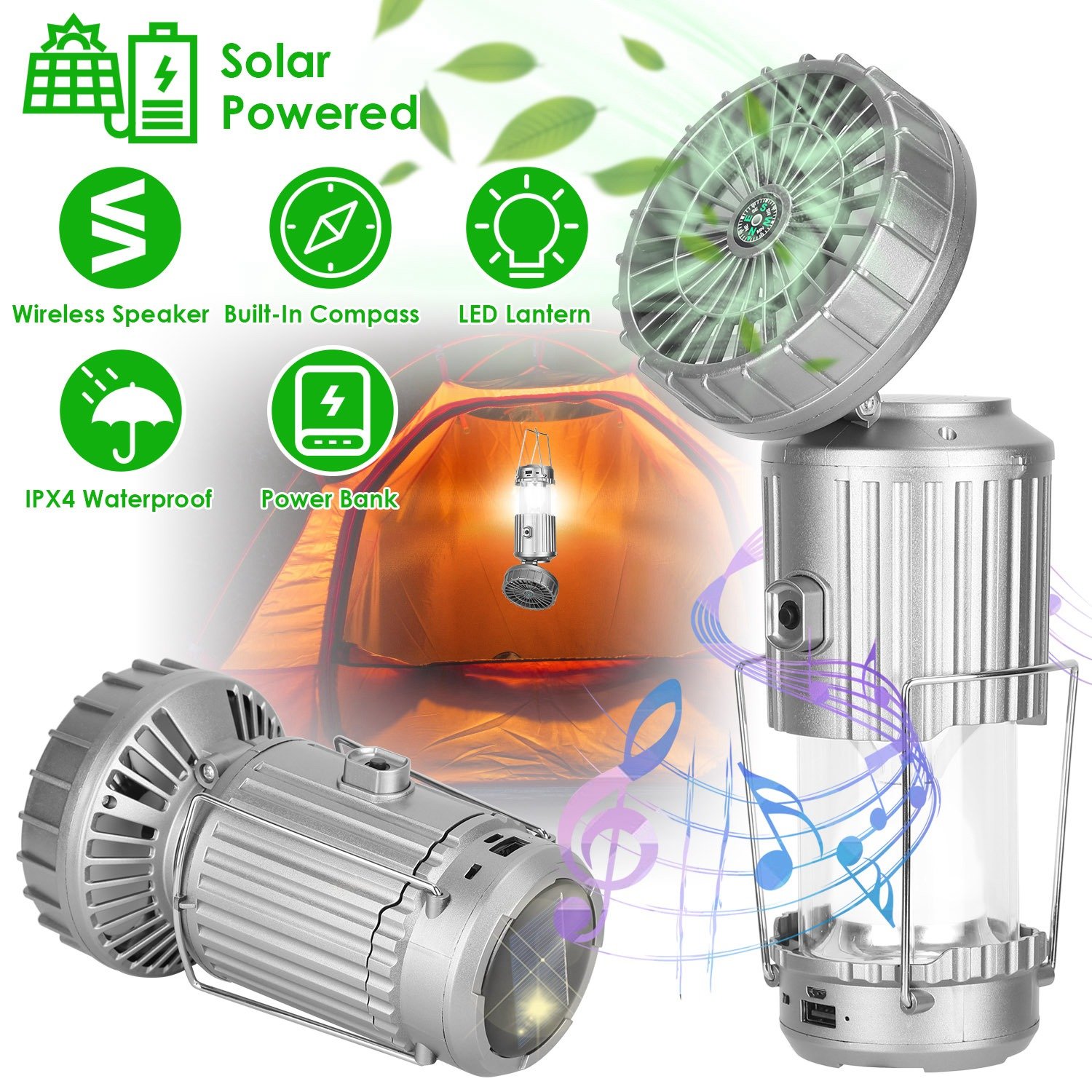 Home > Camping Lantern with Fan Solar And USB Rechargeable LED Camping Fan With Wireless Speaker Compass Power Bank IPX4 Waterproof Emergency Hanging Light F