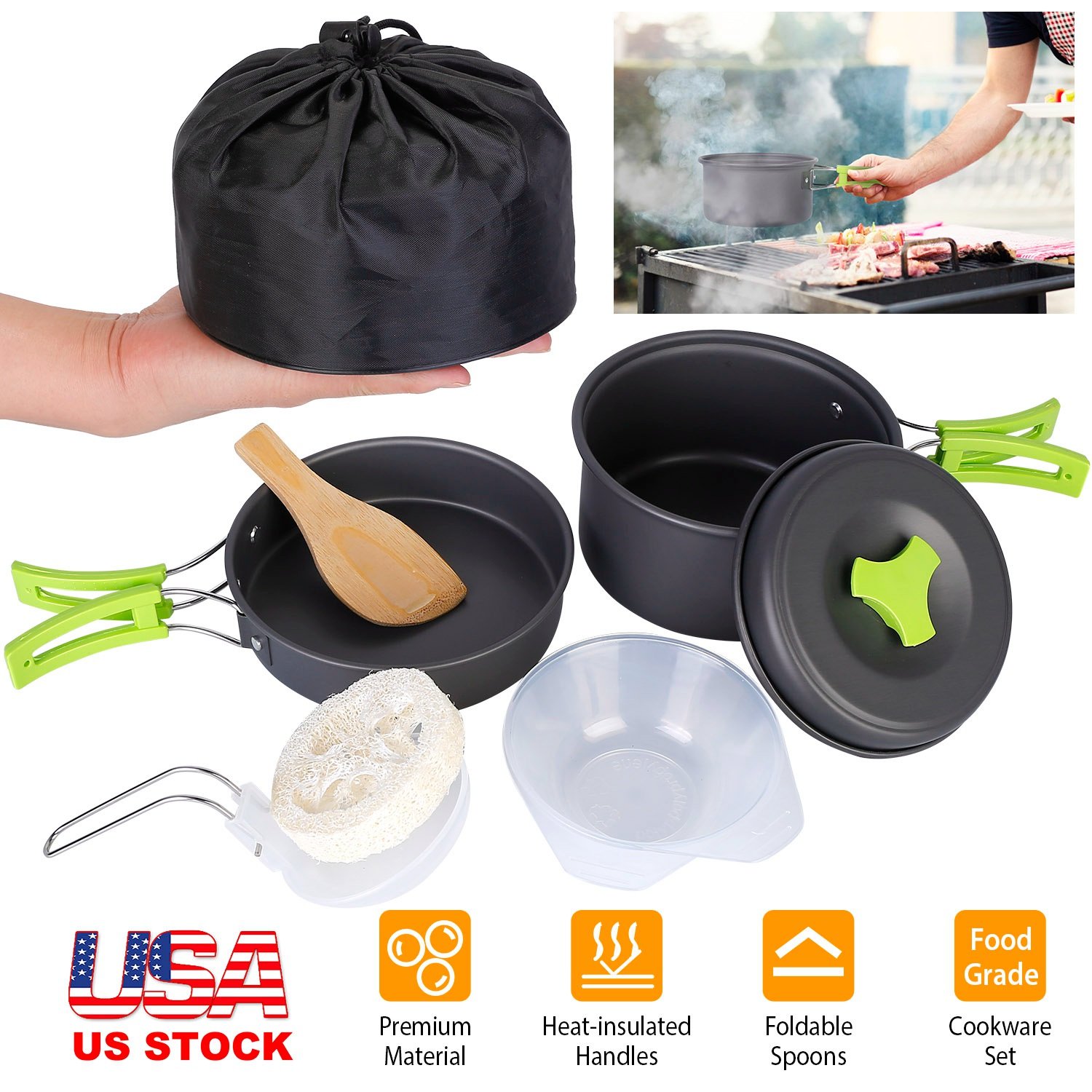 This cookware set contains 1 pot, 1 pan, 2 bowls, 1 spoon, 1 spatula, and 1 cleaning tool for making hot and delicious food during camping, hiking, and any other outdoor activity. Made of non-toxic and lightweight anodized aluminum, it’s safe, easier to clean and carry. Most of this set contains a foldable and heat-insulated handle, which will not burn your hands. The whole set can be packed in a storage bag, space-saving and convenient.