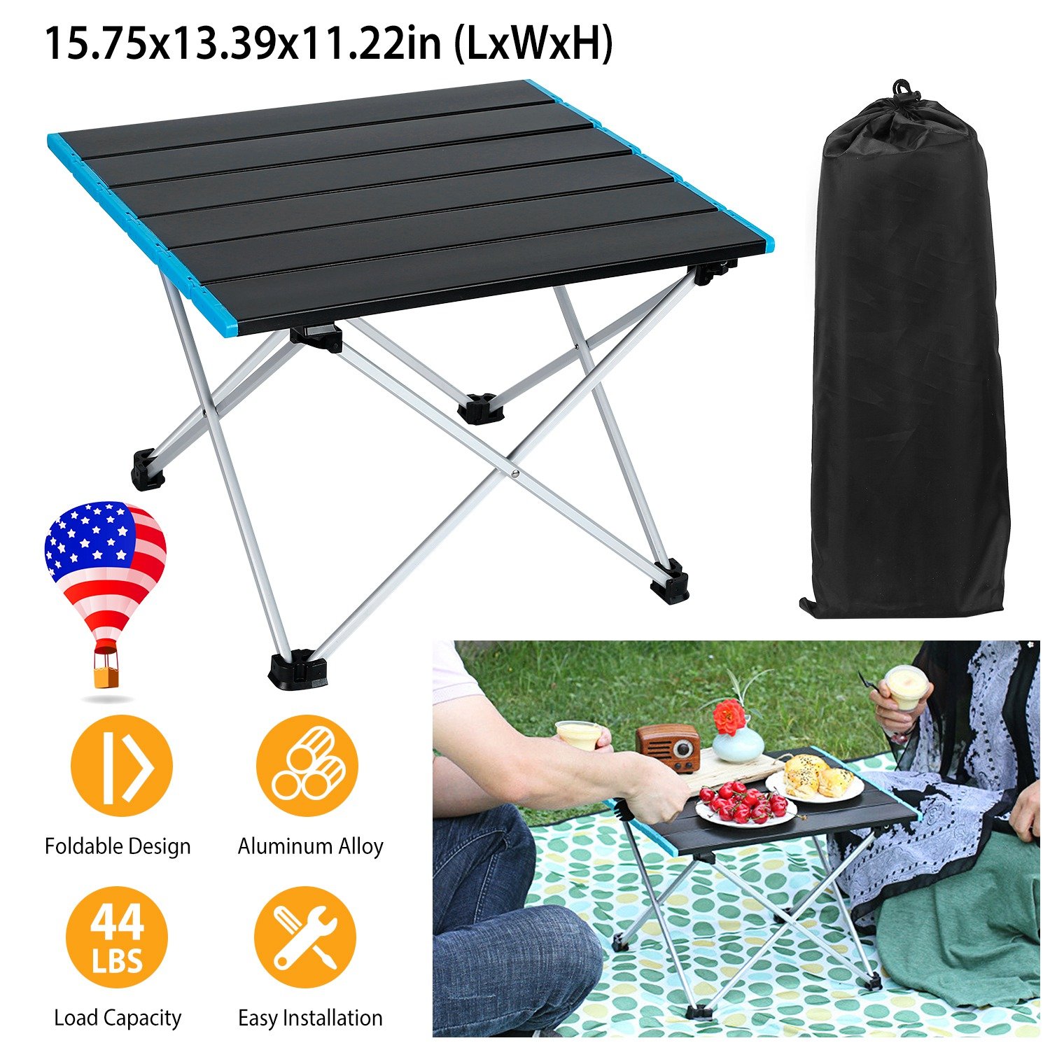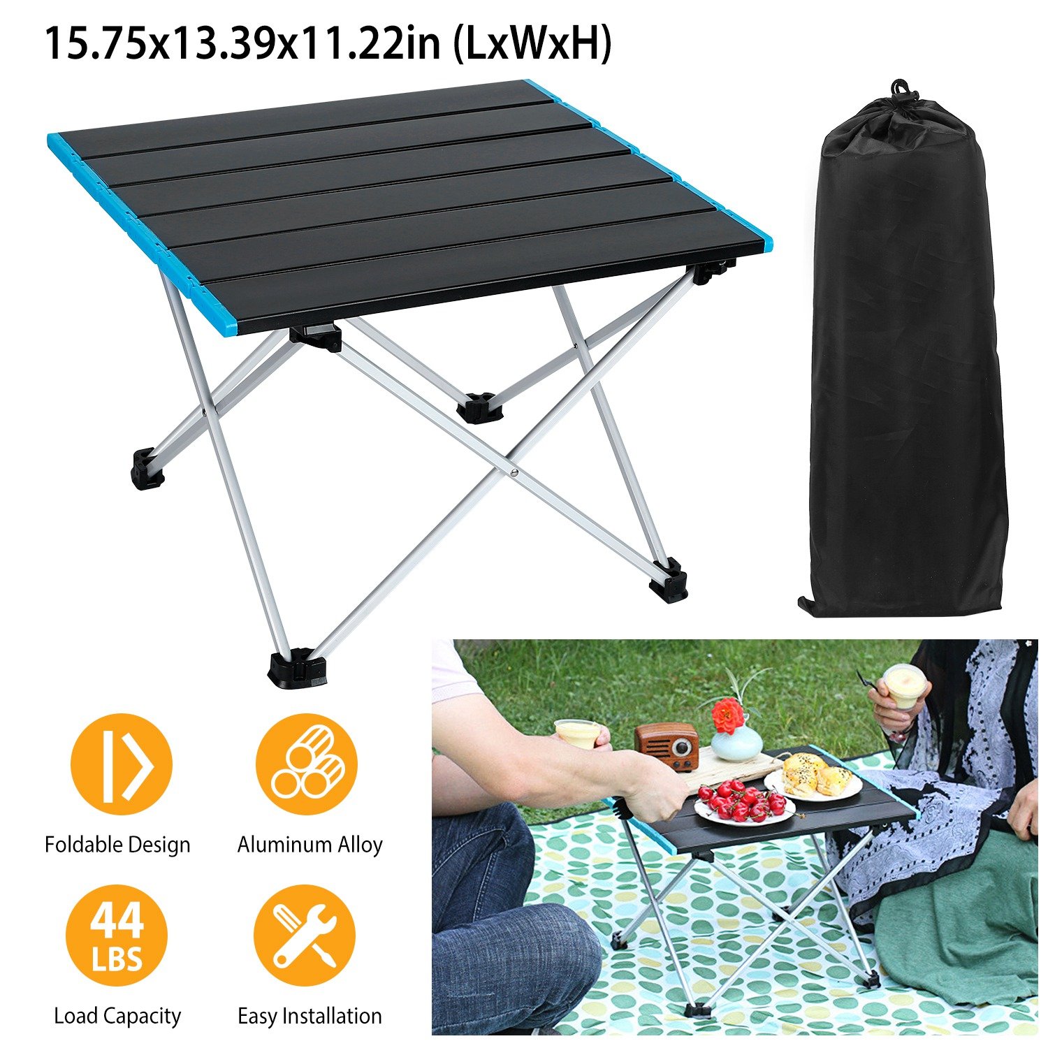 Made of heavy duty aluminum alloy and solid hinged construction, featured with anti-skid feet, our durable table is more safe, sturdy and stable, able to hold up to 44lbs items, not easy to break down. Its foldable design allows it to be stored in the included bag to carry anywhere easily, great for outdoor activities, such as traveling, camping, as well as for a household usage.