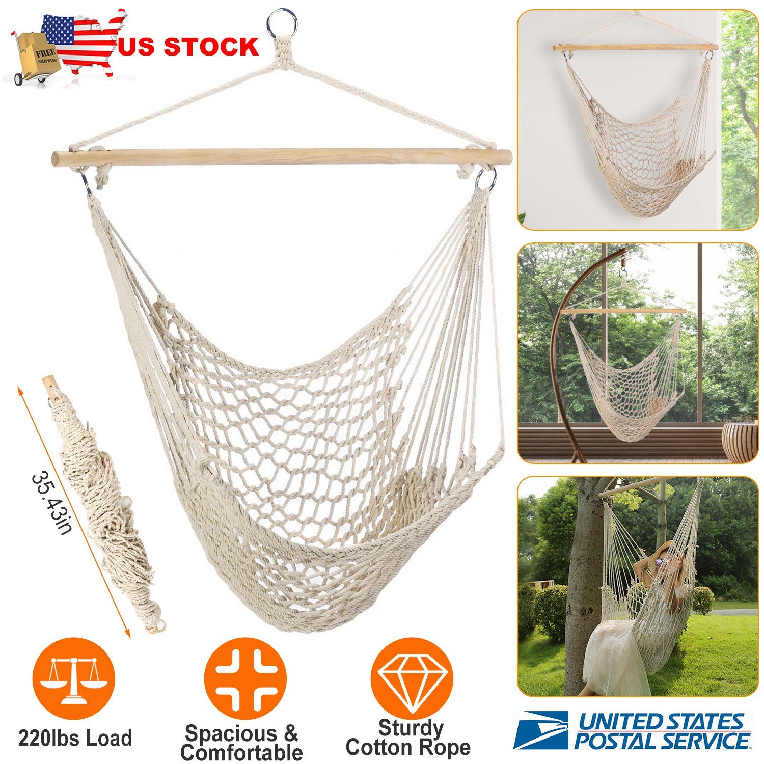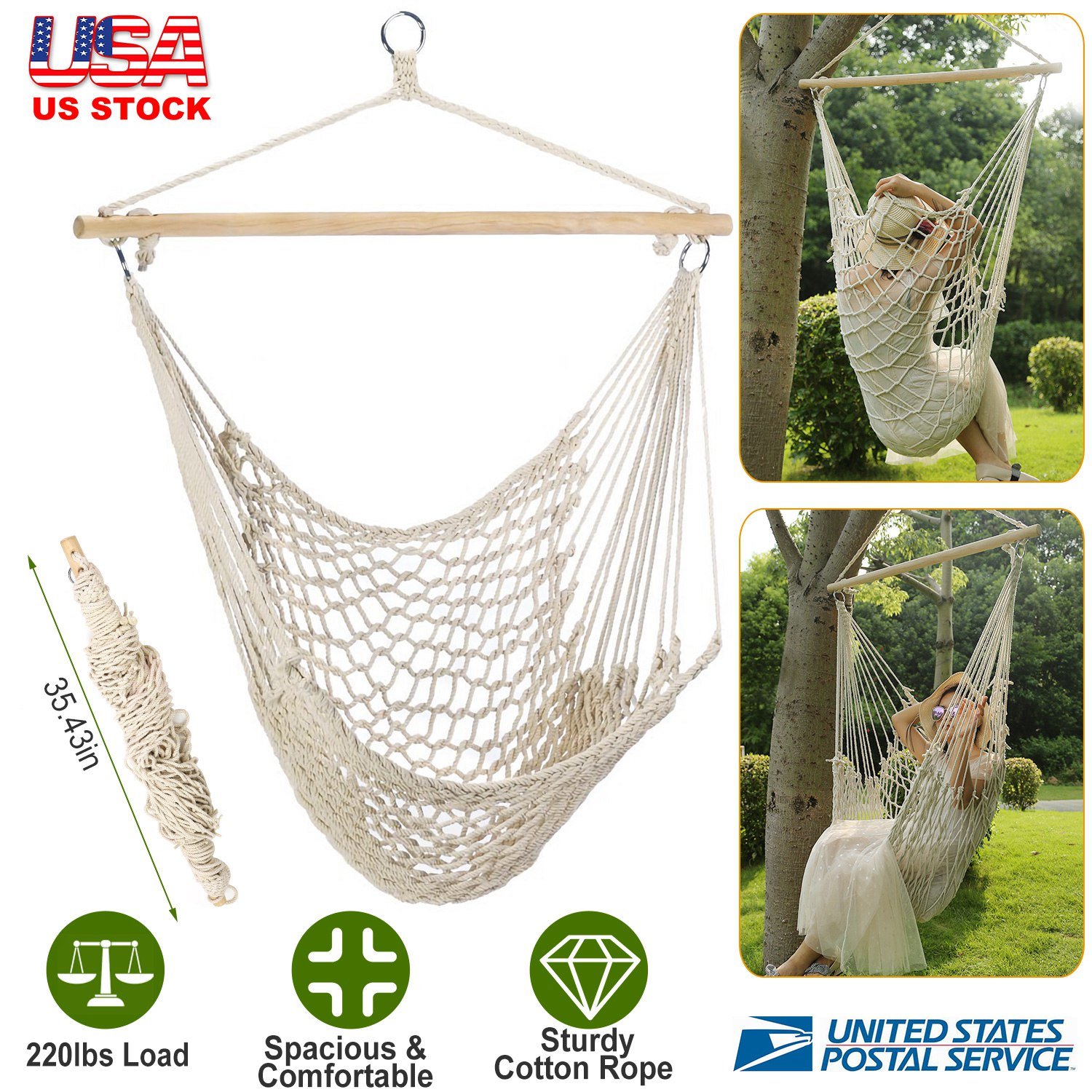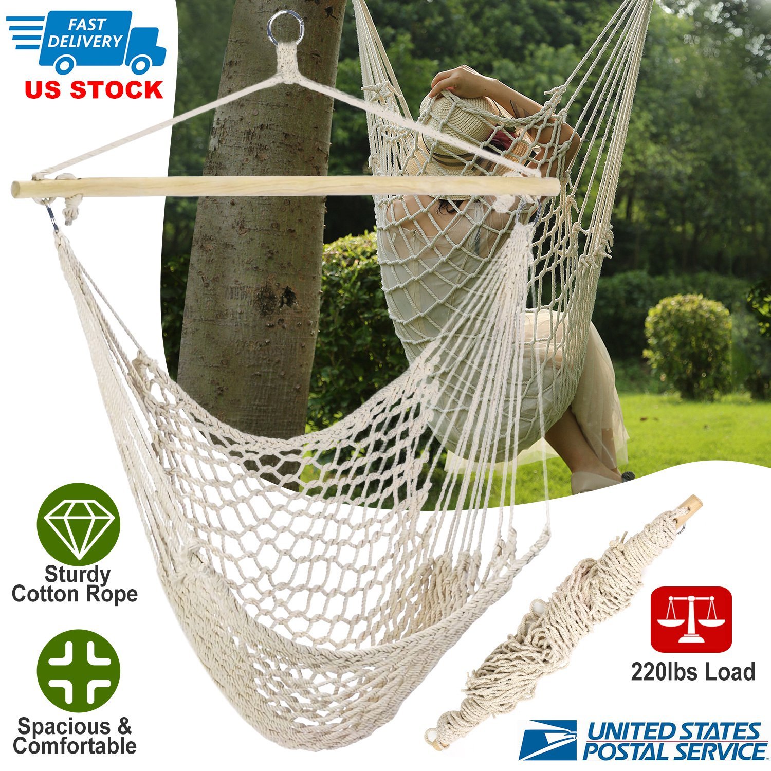 Hammock Chair Hanging Rope Seat Swing w/ Wooden Stick 220lbs Load for Patio Yard Porch Outdoor Bedroom Indoor