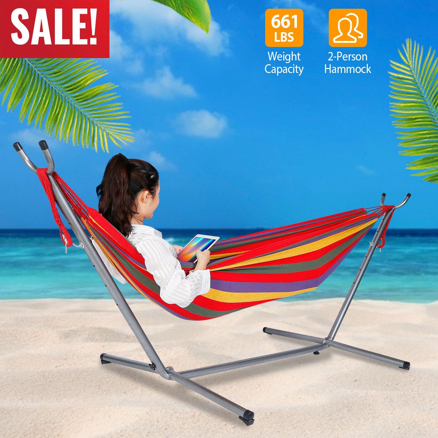 Home > Brazilian Double Hammock 2-Person Steel Canvas Stand Hammock Bed w/ Portable Carrying Case For Patio Beach Yard 661 LBS Max Load